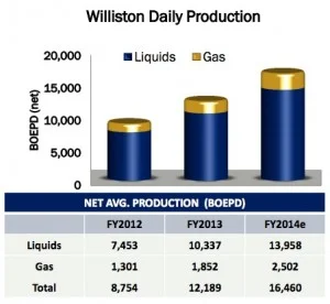 U.S. Energy Corp. has interests across 84,480 gross (3,225 net) acres in Williams, McKenzie and Mountrail Counties, North Dakota. At the end of 2013, the company had participation in 101 gross (10.7 net) Bakken and Three Forks formation producing wells. Due primarily to weather-related issues in North Dakota, the company's Williston Basin production decreased by ~24% during the first two months of 2014 to an average of ~ 625 boe/d as compared to 817 boe/d in the fourth-quarter of 2013.