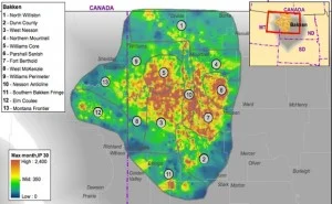 Current figures show the highest initial production rates are on the Nesson Anticline sub-play, with 30-day IP rates of 1000 boe/d. Estimated ultimate recovery (EUR) rates are the highest in the Fort Berthold sub-play at nearly 700,000 barrels of oil equivalent (boe).